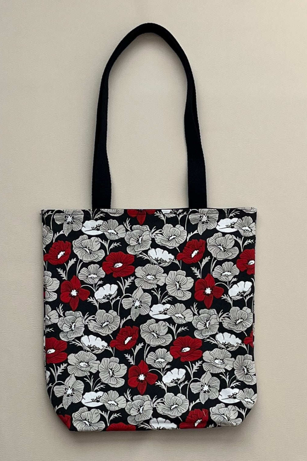 Apportez une touche élégante et pratique à votre quotidien avec notre tote bag "Coquelicots". Son motif raffiné de fleurs rouges, grises et blanches sur fond noir crée un style unique qui s'adapte aussi bien à une tenue décontractée qu'à un look plus sophistiqué.